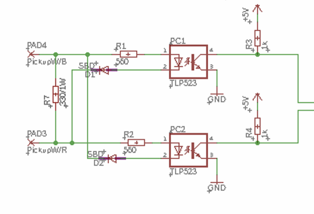 1番左のピックアップ信号と並列に挿入される330Ωは、これを入れることでスレッショルド電圧を高くする?効果があるようで、これを入れるとノイズに対して強くなるようです。しらんけど。また、フォトカプラに流れすぎる電流をこっちにバイパスすることでなんかいい感じになるらしい。結構熱くなるので1W程度のを入れておこう