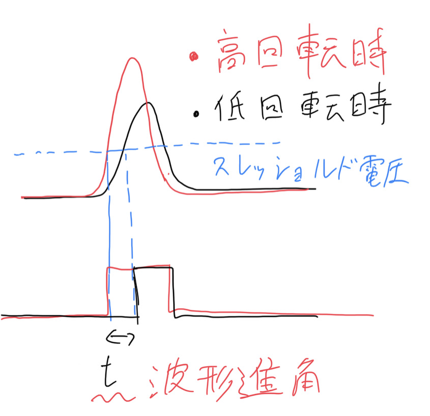 結果として、スレッショルド電圧を超えるのが低速時よりも早くなるので、低速時と比較して図の時間tのぶんだけ進角する。