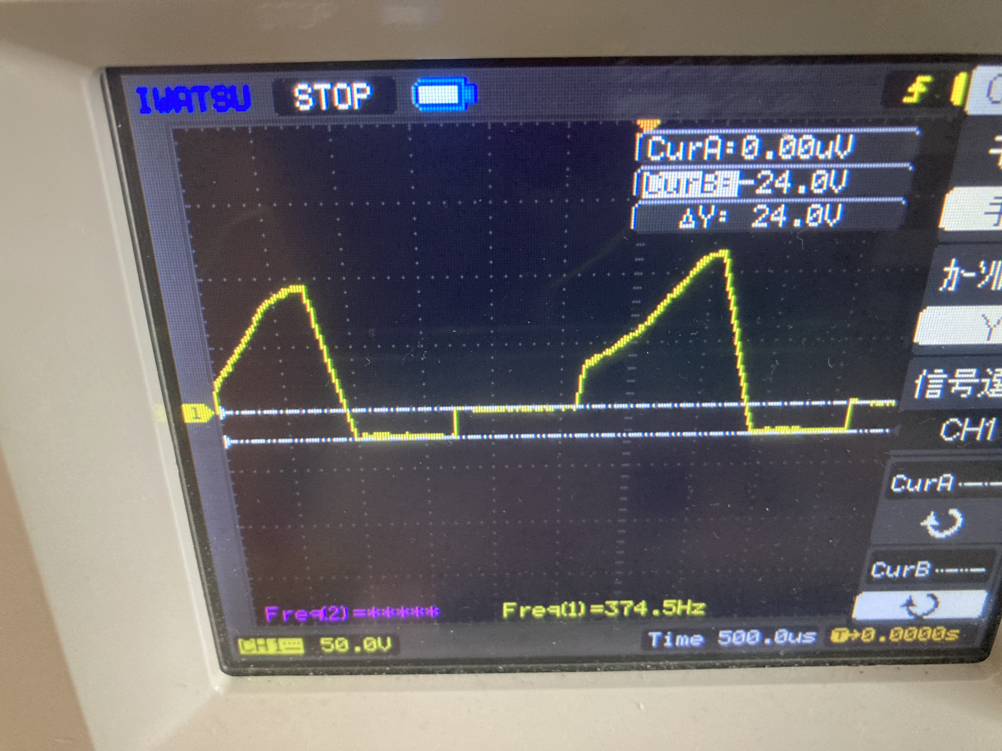 で、波形がこんな感じになります(これは机上試験で実際の部品を使って擬似的にピックアップ信号を出してます)