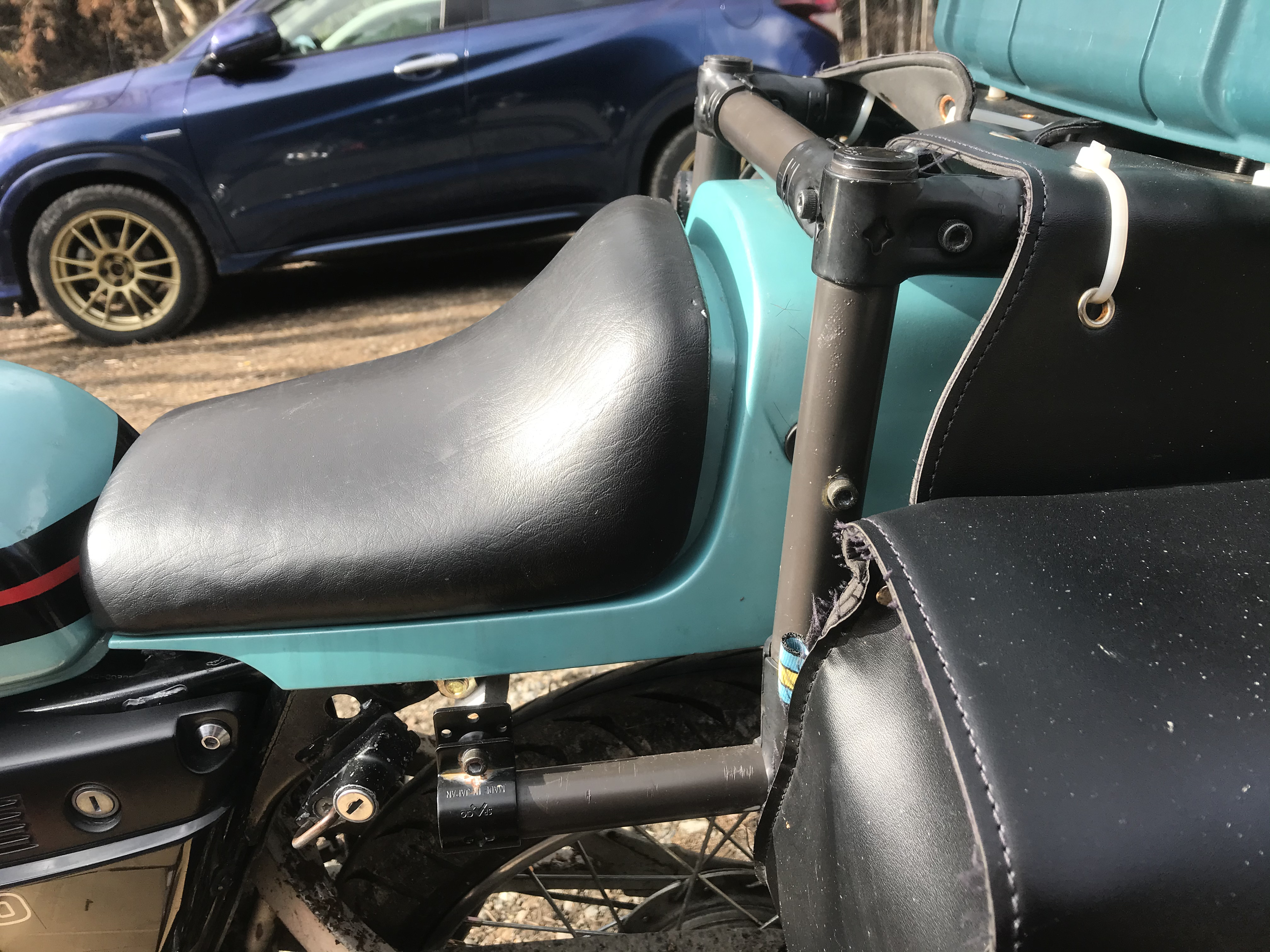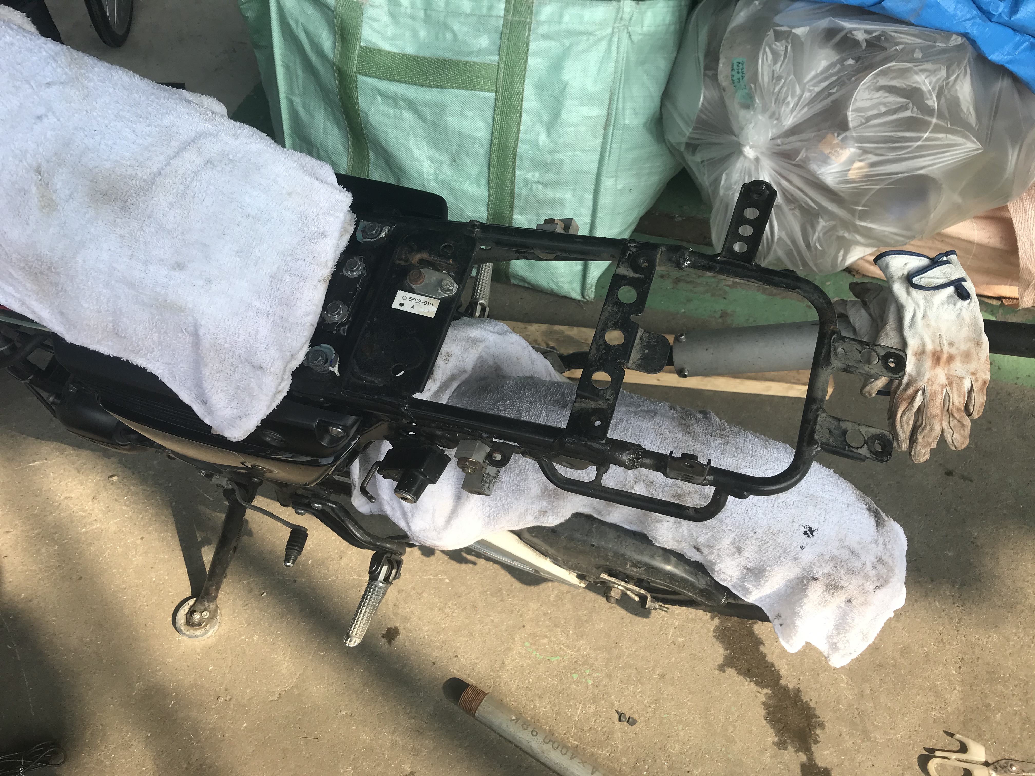 DT50のフレームに継いであるカウルまわりのフレームが折れてます。いやあ、エンジンブローの次はフレームブローかぁ