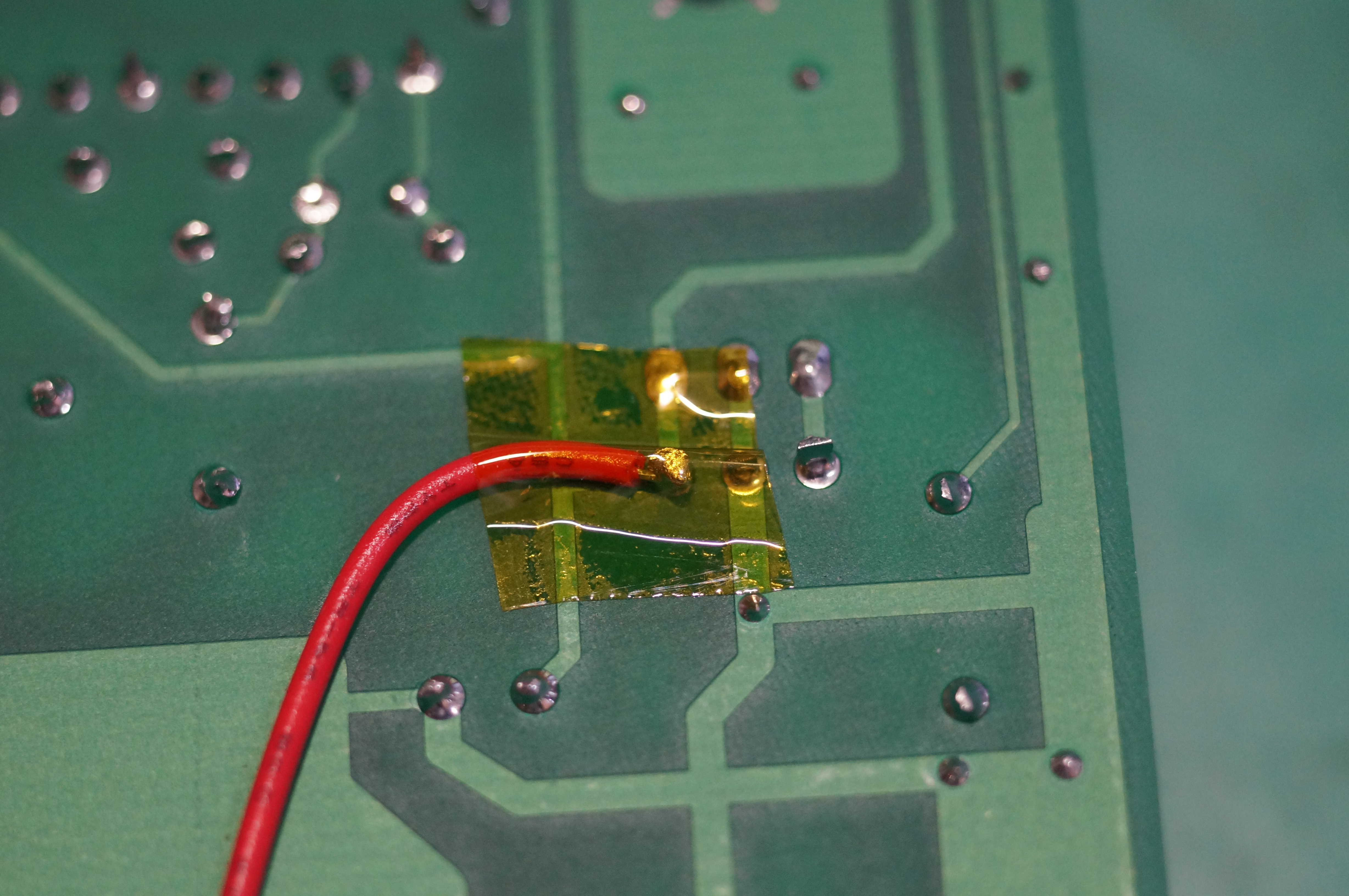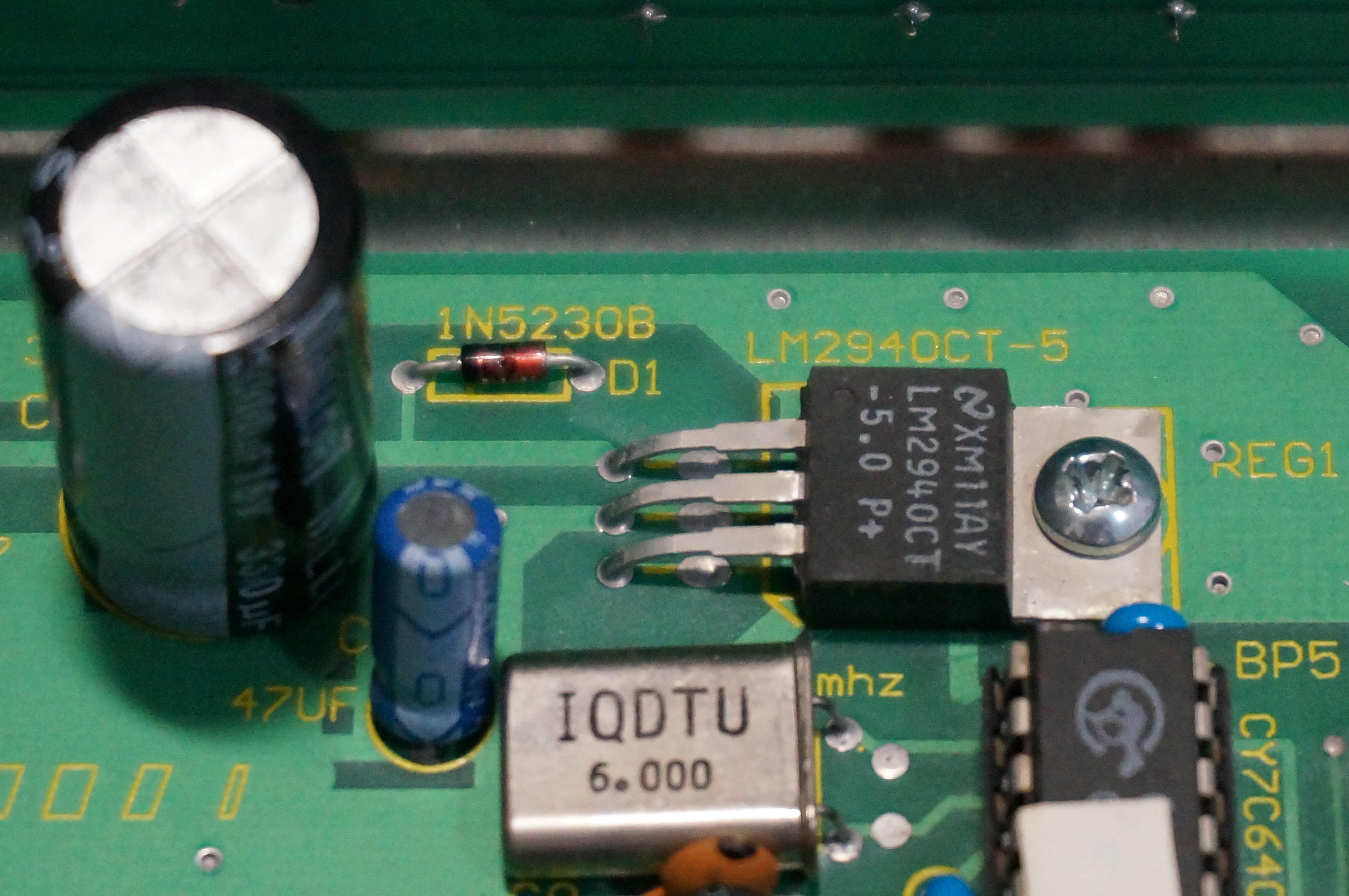 左下がUSBコネクタ側、右上がレギュレータの出力部分です。