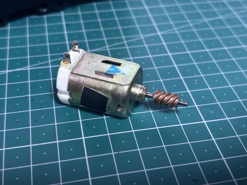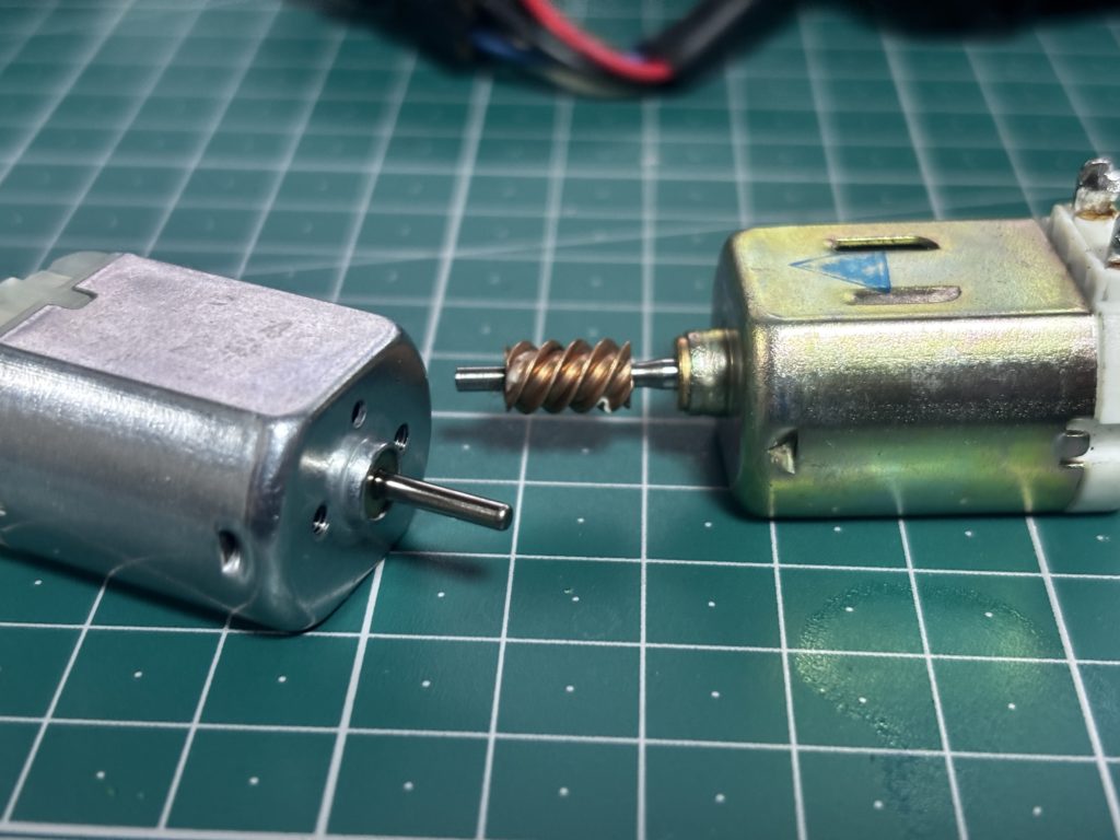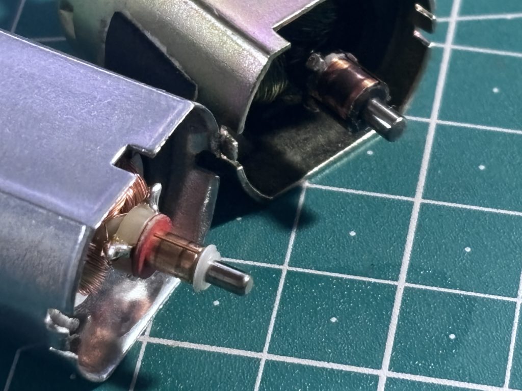 であれば、新品で買ってきたブラシ部分なり永久磁石部分(ベアリング・ブッシュ付き)を、車体に付いていたアクチュエーターモーターの軸(回転子)のみを新しいやつの中身と入れ替えてやれば、修理すべきところは完璧に交換できる、という見立てです。軸が摩耗しているなんてことはなかなかないですし、たぶんいけます。物によっては逆回転のモーターもあるとか聞きますし、そういう点でも電気子以外を移植する、というのはメリットが多いように感じます。構造としてはミニ四駆のモーターと一緒ですし。
