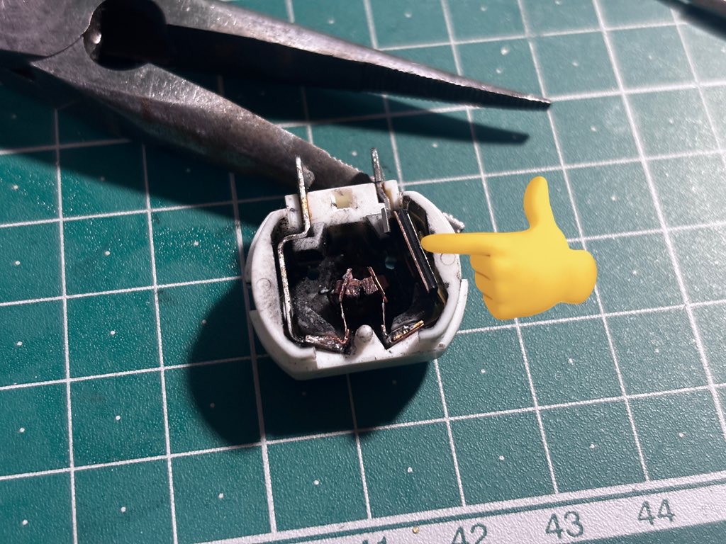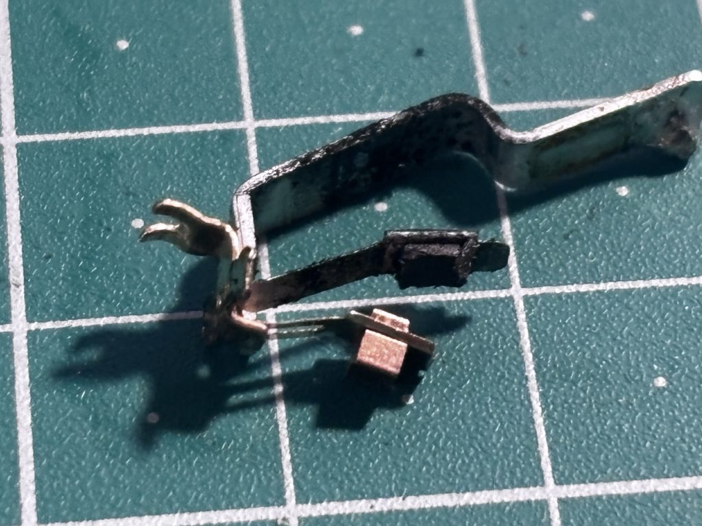 そこでふと、謎の部品があったことを思い出した。何故かブラシの金具が一体物ではなく、謎のスペーサーが挟まっていたこと。これ、スペーサーじゃなくてポリスイッチかサーモスタットなのでは…?それであれば経年劣化で抵抗体がおかしくなって高抵抗故障モードでモーターが回らなくなるという説明がつく。