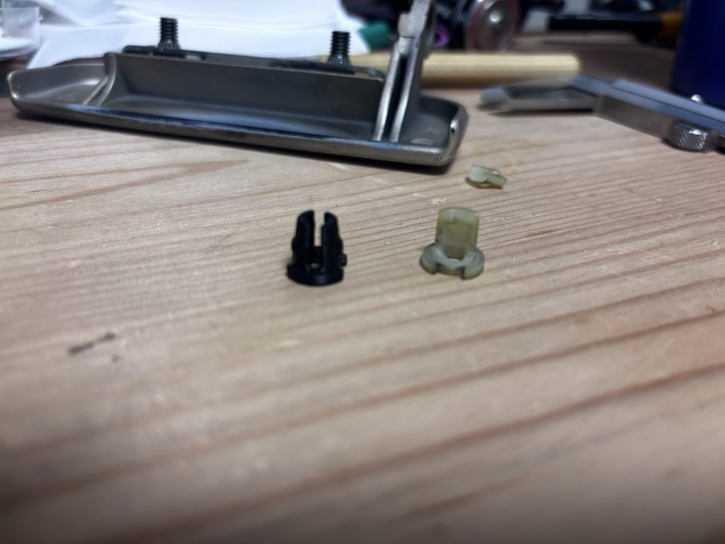 ここの部品、どうやらドアノブASSYでしか出てこないらしく…困りました。まあS110Pハイゼットとかのやつを買ってつけりゃいいんでしょうけど…それまでドアノブつけられないし、これをそのままつけようものなら、万一脱落した時に運転席外側からドアが開けられなくなり、スーパーダルイ事態になります。