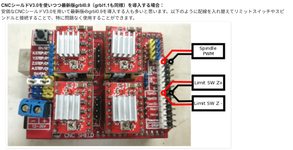 みら太さんより頂いたCNC Shield V3.0は過去に中華で安価に出回っていたものだ。こちらも前情報で最新版だとピンの入れ替えが必要というように聞いていた。至れり尽くせりである。